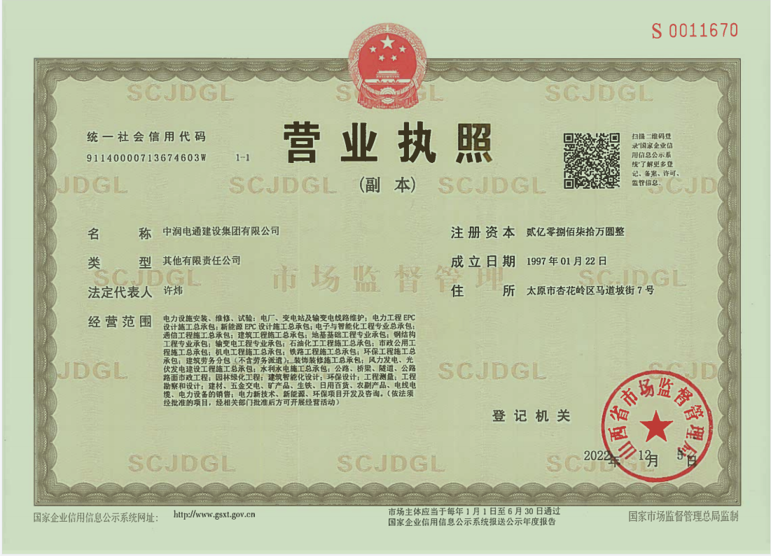 中潤電通建設集團有限公司成立于1997年,是按現代企業制度組建,主要服務于******電網、******電投、華能、華電、國電等央企及省屬國有大中型企業。主要包括電力工程施工(輸變電線路架設及檢修;變電站土建和電氣安裝、檢修、調試),新能源開發建設(風力發電和光伏發電整體項目建設及運維)。